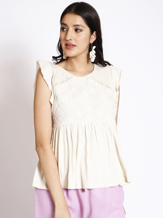 Floral Embroidered Gathered Detailed Pure Cotton Top
