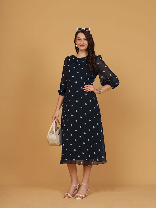 Navy Blue Polka Dot Chiffon Midi Dress with Puff Sleeves
