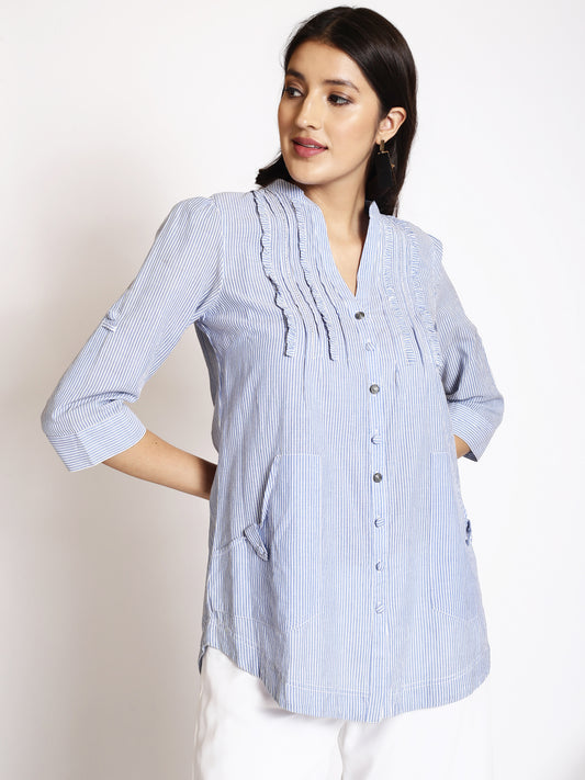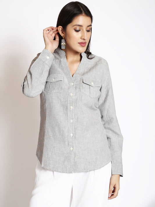 Pinstriped Mandarin Collar Cotton Casual Shirt